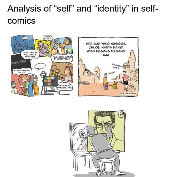 When comic artist creates a personal comic, whose identities portrayed in the comic? Himself or his reconstructed image? More so, when the comic is published in social media, many viewers presumed that the comic is a mirror of the auteur life itself. This is where the constructed identities and real identities is reconstructed: negotiated, blurred between fiction and non-fiction.As an art, comics are a nexus of contexts and content, text-subtext, and ideology-identity. The important linking nodes of all that is the auteur. As the auteur's medium of expression, comics are equally great; comics can be either biographical or autobiographical. Comics can be a fragment of realism and hyper realism, but also as self-and identities. The perspectives of self (theory) and (social) identities is a problematic negotiation between social and cultural construction and individual expression. By employing characters, plots, environments familiar to the author, artist construct narratives about themselves, about who they are, what they want to become, what they feel, what they want to say, and what left unsaid in real life. Stories are consist by an line up of self-characters with a specific role, with life goals, living values which staged inside a “what if” universe. (Holland, Lachicotte, Skinner, & Cain, 1998). This research tries to critically discusses the boundaries between them, and the artistic impact or art to the artwork. It then progresses to discuss in understanding the mechanics of performative aspect of identities to deliver a text-subtext messages to their reader in Foucaultian manner. Within the theoretical framework of self theory (Burke, 1980), and social identity theory (Turner, 1980) implemented to two (3) artwork, specifically: French comic Guy Delisle’s “Bad Parenting” series, Indonesian comic Sheila Rooswitha’s “Sheilas Playground,” and writer’s own comics “Dog-walking” series. These comics is comics about each author’s daily life, were told in a comic strip format, and published once-twice a week. They were chosen by the salience level of reality asserts by the story, and the similarity level between self-identity, or identity-constructed identity.