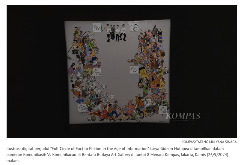 Dalam pameran itu, kompleksitas perjalanan pesan atau informasi digambarkan Gideon Hutapea lewat karya berjudul ”Full Circle of Fact to Fiction in the Age of Information”. Kartun ini menggambarkan bagaimana pejabat menyampaikan pesan kepada media. Pesan itu diilustrasikan dengan gambar seekor kucing.